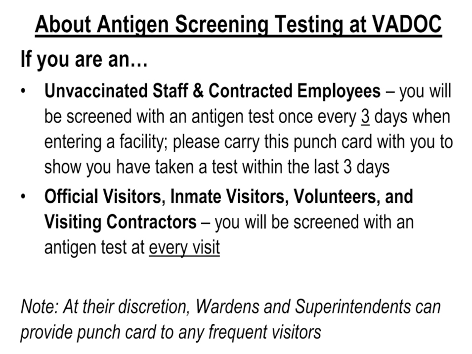 test once every 3 days when entering a facility; please carry this punch card with you to show you have taken a test within the last 3 days - Official Visitors, Inmate Visitors, Volunteers, and Visiting Contractors – you will