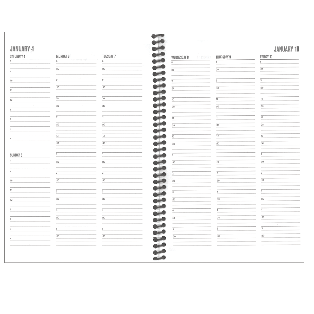 Use your weekly planner to record appointments and put overbooking in the past! Your planner will make sure that you are always prepared for the days, weeks, and months ahead. A week at a glance. Your entire schedule is at your fingertips. Printed with a 12mil Poly cover, 24lb text inside with a spiral bound.